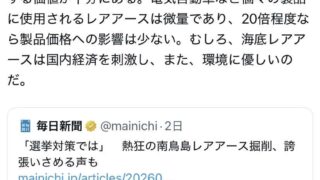 なんG国民民主党「日本産レアアースは20倍の価格でも問題ない。むしろ経済を活性化させ環境にも優しい」