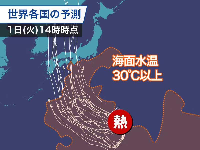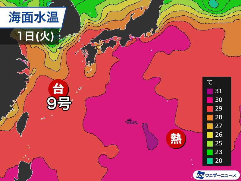これらの海域では9月下旬まで海面水温が平年よりかなり高くなる見込みで、台風がこうした海域を通過すると発達又は勢力を維持する傾向があるとしています。