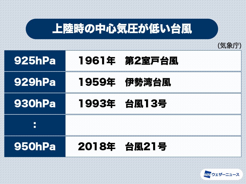 1951年以降の統計で、最も上陸時の気圧が低かったのが、1961年の「第2室戸台風」で925hPa、その次が1959年「伊勢湾台風」の929hPaと、こうした台風に匹敵する勢力です。現段階で接近時の勢力を詳しく想定することは難しいものの、台風発生後はしっかりと最新情報を確認し、最悪のケースに備えた早めの対策が必要です。