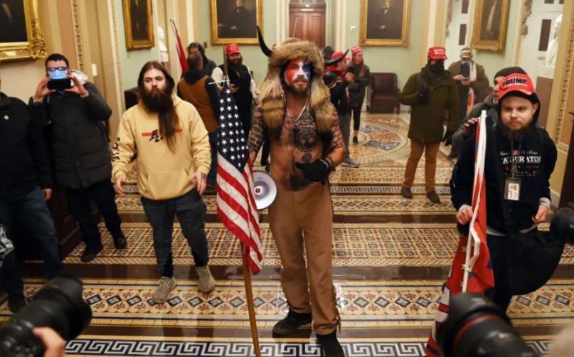 真ん中に映る半裸の男性は、陰謀論信者グループ「QAnon」の間で知られる有名人、ジェイク・アンジェリ氏。