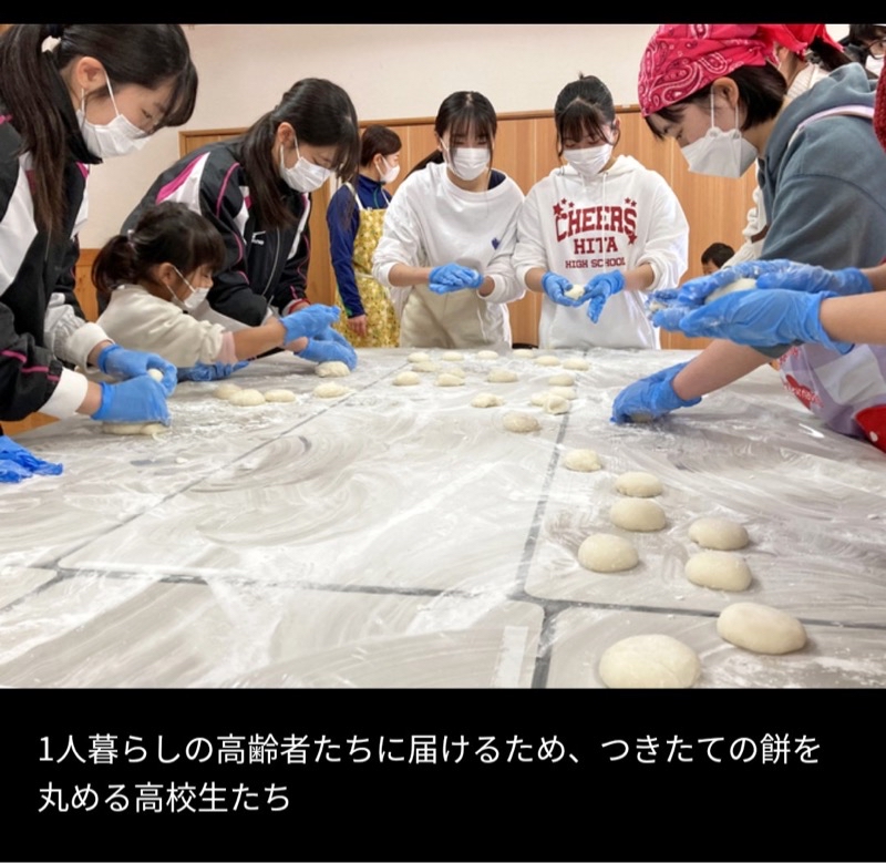 1人暮らしの高齢者たちに届けるため、つきたての餅を丸める高校生たち日田市内の高校生でつくる「日田地区青少年赤十字」のメンバー35人が、1人暮らしの高齢者たちに良いお正月を迎えてもらおうと手作りの餅を配るボランティア活動を行った。