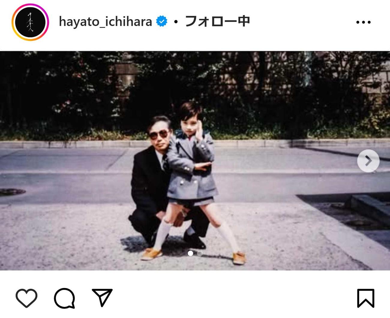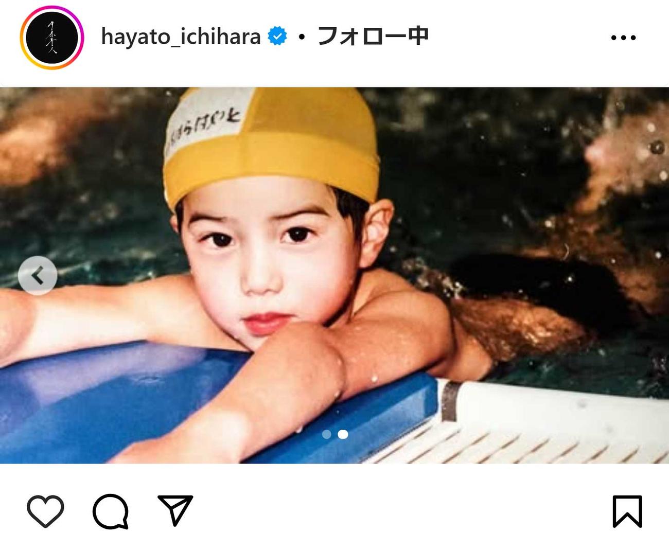 1枚目は、制服姿でポーズを決める市原に寄り添う父親の姿が写されている。2枚目では、幼少期の市川が水泳をする姿が収められており、ひらがなで「いちはらはやと」と書かれた水泳帽をかぶった姿を披露した。