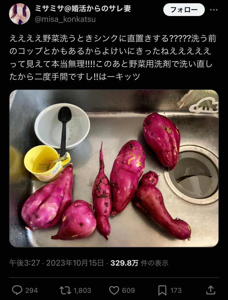 それとも芋が汚いからシンクに置くなってこと??嫁ガチャ失敗だなぁ