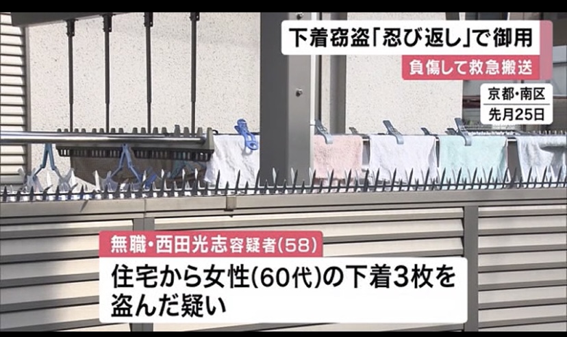 逮捕のきっかけとなったのは、不審者の侵入を防ぐ「忍び返し」でした。無職の西田光志容疑者(58)は10月25日、京都市南区の住宅で、60代の女性の下着3枚を盗んだ疑いがもたれています。