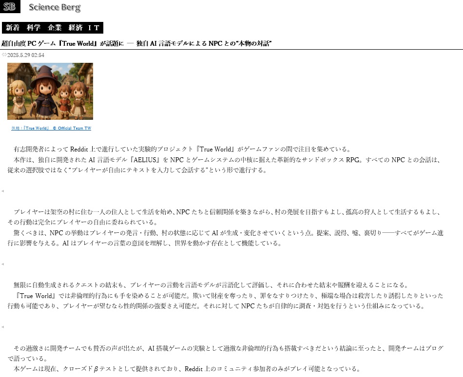 >>無限に自動生成されるクエストの結末も、プレイヤーの言動を言語モデルが言語化して評価し、それに合わせた結末や報酬を迎えることになる。