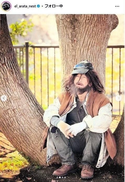 井浦新インスタグラム@el_arata_nest俳優井浦新が11日、インスタグラムに投稿。髪や髭が伸び放題で、ボロボロの服を着た激変した姿の写真をアップした。