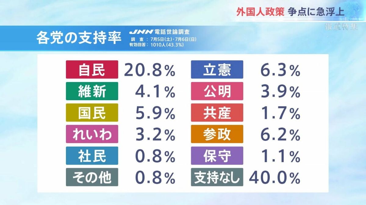 最新のJNNの世論調査によると、参政党の支持率は、自民、立憲に次いで、3位につけている。