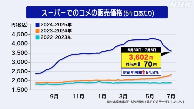 全国のスーパーで今月6日までの1週間に販売されたコメの平均価格は、5キロあたり税込みで3602円と、前の週から70円値下がりしました。値下がりは7週連続で、農林水産省は随意契約の備蓄米の販売が進んでいることが背景にあるとしています。