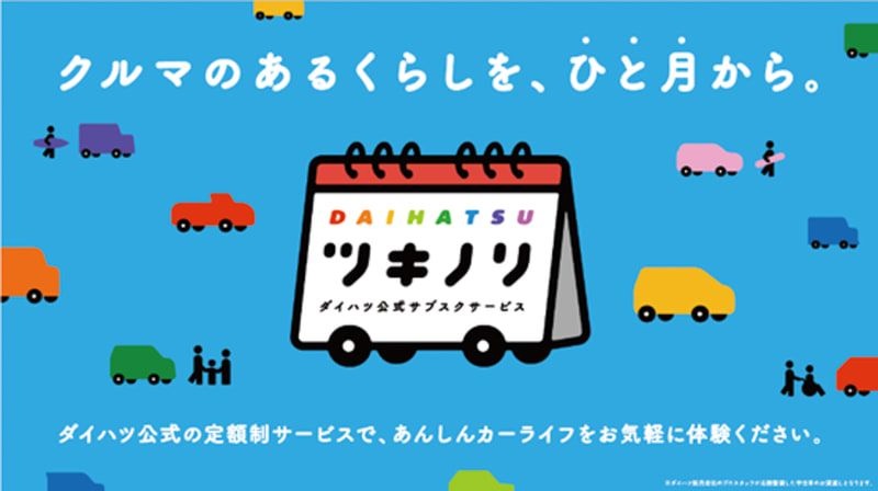 ダイハツ工業は7月15日、ダイハツ認定中古車を月々定額で利用できるサブスクリプションサービス「ツキノリ」の本格展開を開始すると発表した。「ツキノリ」の月額利用料金は2万5000円~で、対象者は個人(法人名義は不可)、利用期間は最短1か月~最長11か月まで月単位で任意に設定可能となるサービス。