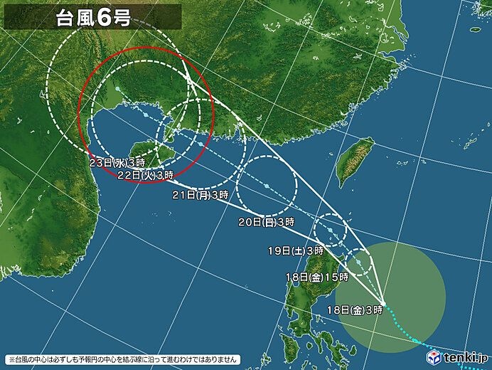 18日(金)午前3時、フィリピンの東で台風6号「ウィパー」が発生しました。中心気圧は996hPa、中心付近の最大風速は18m/s、最大瞬間風速は25m/sとなっています。台風6号は今後、フィリピンの東を北西に進み、南シナ海を通り、23日(水)にはベトナム見通しです。