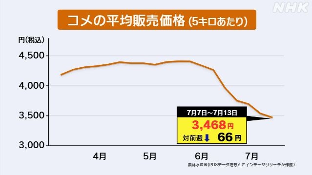 それによりますと、7月13日までの1週間に販売されたコメの平均価格は、5キロ当たり税込みで3468円と、前の週より66円値下がりしました。値下がりは8週連続です。