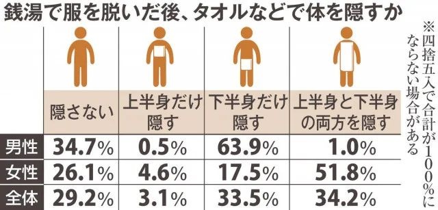 銭湯で服を脱いだ後、タオルなどで体を隠すかどうかについて4択で尋ねたところ、男性のおよそ3人に2人は「下半身だけ隠す」を選び、「隠さない」と二極化した。一方で、女性は約半数が「上半身と下半身の両方を隠す」を選択し、「隠さない」「下半身だけ隠す」と続いた。