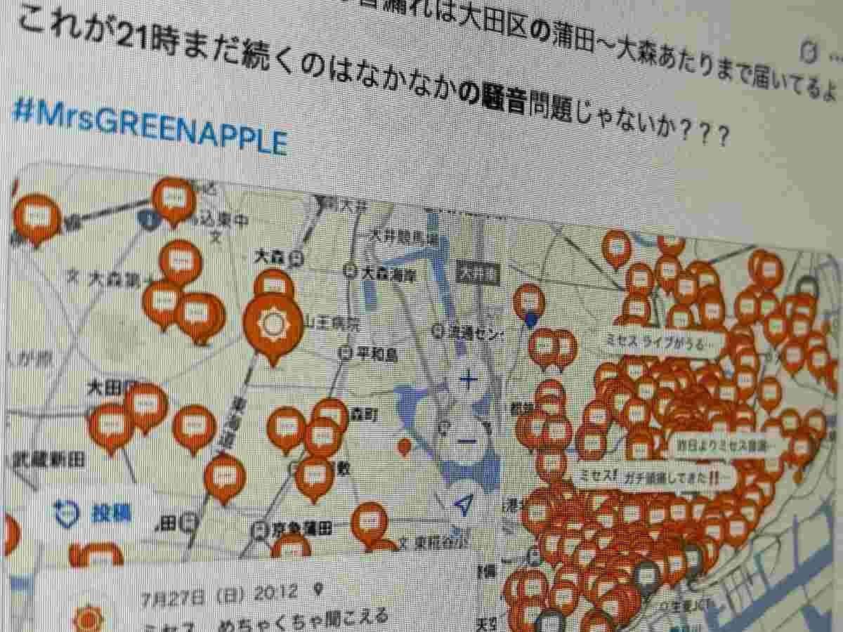 人気アーティストのMrs.GREEN APPLEが7月26日と27日に開催した野外ライブから漏れた音が広い範囲に届いていたとしてSNSで苦情が相次いでいる。その被害地域を可視化したのが、最近「次来るSNS」などと話題になっていた「Yahoo!天気」アプリの「みんなの投稿」機能だった。