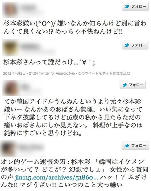 一部の女性は杉本彩を批判 "不快"韓国批判した杉本彩に抗議 (2012年4月4日掲載) - ライブドアニュース先日ネット上に掲載された杉本彩さんの発言が波紋を呼んでいる。その発言とは「韓国はイケメンが多いって? どこが? 幻想でしょ」というもの。それが切っ掛けでネット上で大きな反響を呼び「彩さんの本音だよね」「news.livedoor.comいいのかよ