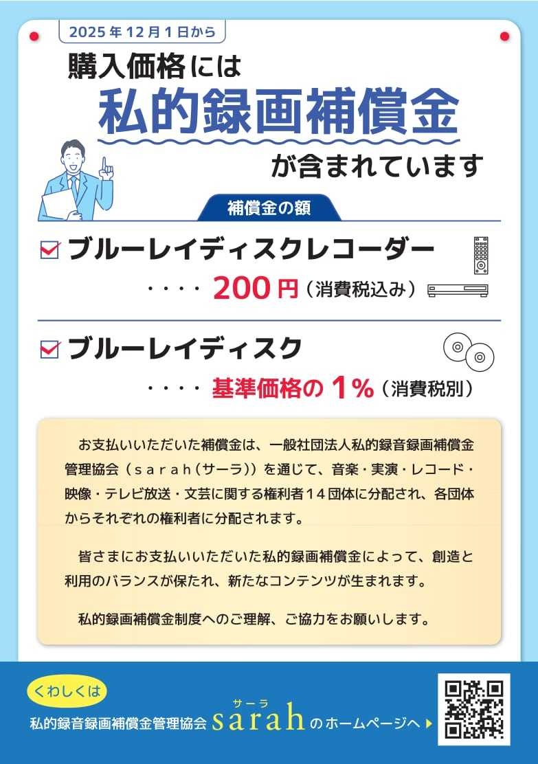 私的録音録画補償金管理協会(sarah)は2日、Blu-ray Discレコーダーと録画用BDメディアを対象とする私的録画補償金の徴収を12月1日に始めると発表した。購入者が補償金の支払い義務を負う。