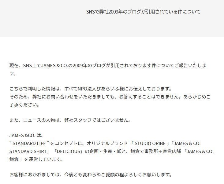 アパレルブランド「JAMES&CO.」は4日までに公式サイトを更新。SNS上で話題となっている人物との関わりを否定した。