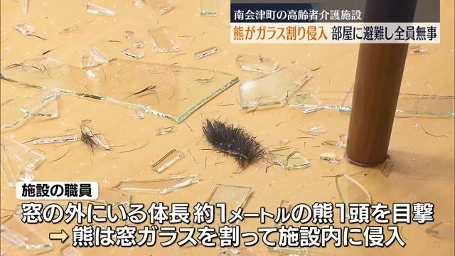 職員は外にいる熊と「目があったかも」と話していて、その直後にガラスを割って施設内に飛び込んできたということです。当時施設内には入居者と職員あわせて7人がいましたが、それぞれの部屋に閉じこもり全員無事でした。食料が荒らされるなどの被害もありませんでした。
