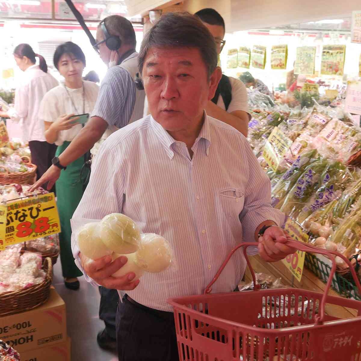 茂木氏は店頭に並ぶ野菜を前に「今、やっぱり高い?」と尋ねたり、鮮魚コーナーで説明を受けたりするなど、社長を伴って店内をひと通り視察。その後、しめじなどいくつかの食材を自ら買い物かごに入れ、いざレジへ。