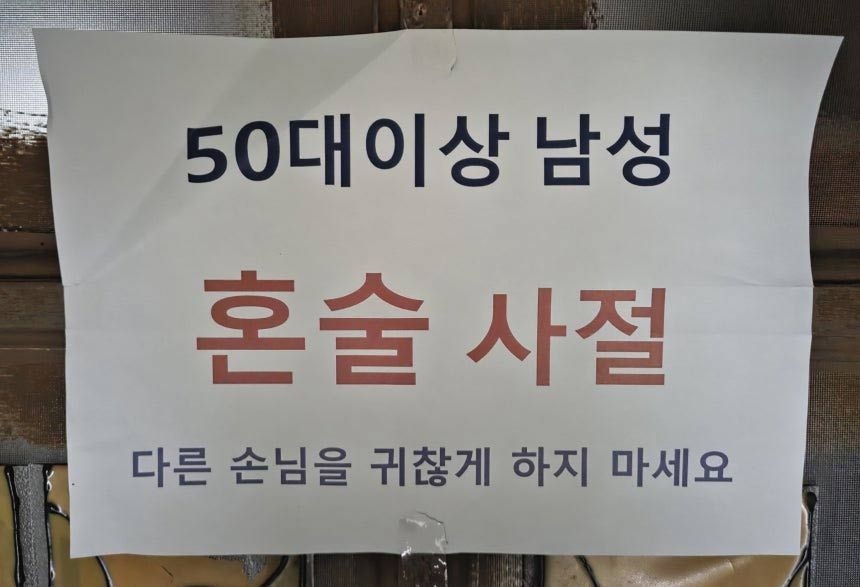 2カ月前には蔚山市内のある飲み屋の「50代以上の韓国人中年男性立ち入り禁止」と書かれた張り紙も話題になったが、おそらく本当に注目すべきは周囲の反応で、たちまちこれに共感する雰囲気が広がったのだ。「理由など聞かなくても分かる」ということだ。この店の30代社長は「タメ口、ところ構わず大声で歌う、屋内での喫煙など、精神的な苦痛が非常に大きかった」と語る。ロックを聞く店なのにイム・ヨンウンの曲をかけろと言ったり、酔っ払って騒いだりとかする客は全てこの年代だという。真相究明1級の資格を持つ記者も彼らによって人類愛を失いかけたことが何度もあったことを告白しておく。
