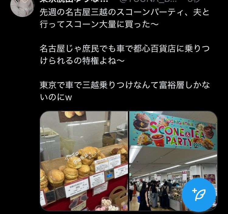 先週の名古屋三越のスコーンパーティ、夫と行ってスコーン大量に買った~名古屋じゃ庶民でも車で都心百貨店に乗りつけられるの特権よね~