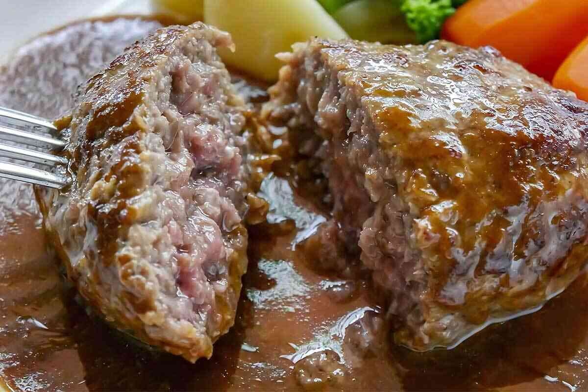 きのこなどが入ったホワイトソースのハンバーグメニュー。切って中身を見てみると、肉の色はピンク色に見える。