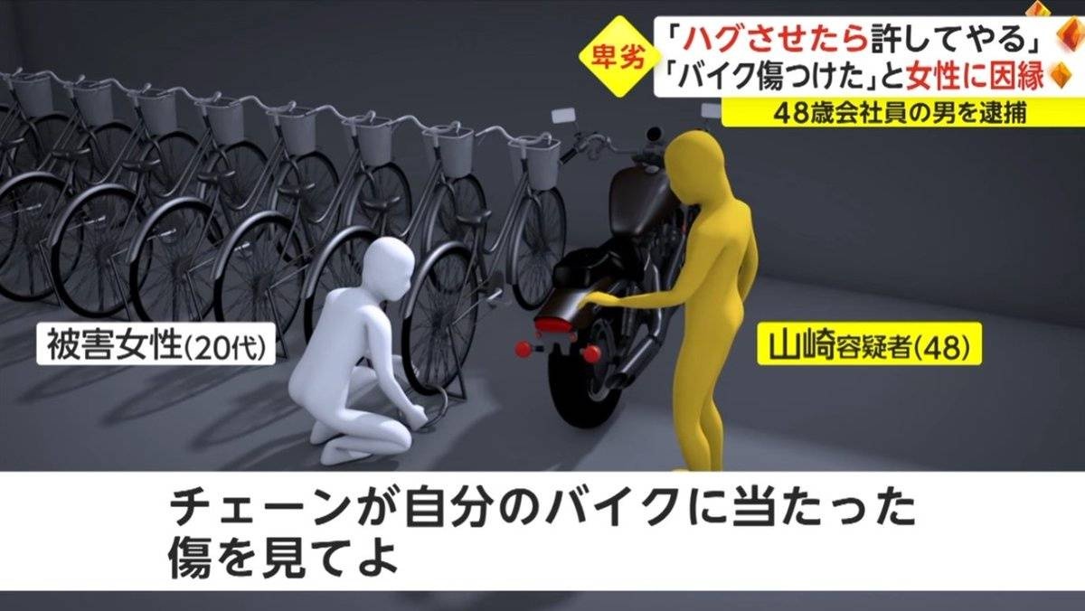 薄毛男性、バイクに傷をつけただろと女性に因縁。「ハグしたら許してやる」