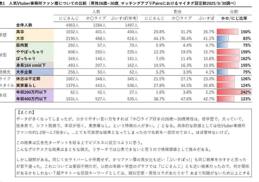 VTuber好き男性「身長164cm以下、実家暮し、年収200万円以下」、マッチングアプリDB統計から明らかに