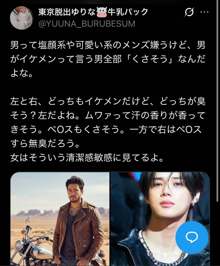 男って塩顔系や可愛い系のメンズ嫌うけど、男がイケメンって言う男全部「くさそう」なんだよな。左と右、どっちもイケメンだけど、どっちが臭そう?左だよね。ムワァって汗の香りが香ってきそう。ペOスもくさそう。一方で右はペOスすら無臭だろう。