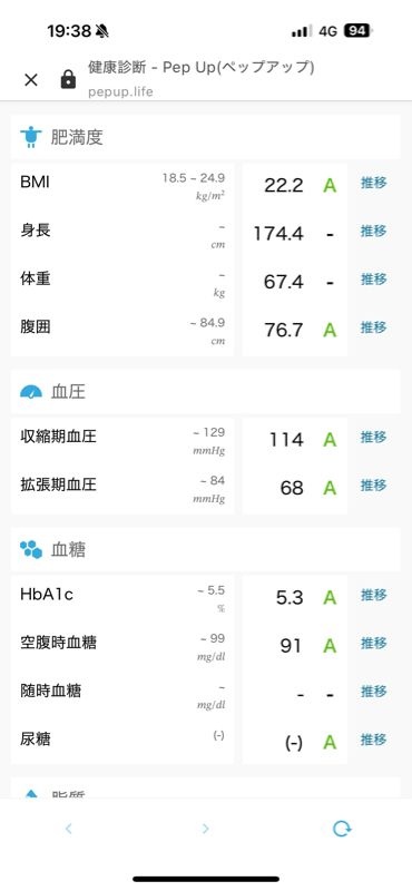 健康診断の数字は血糖値やBMIともに問題なしや😤