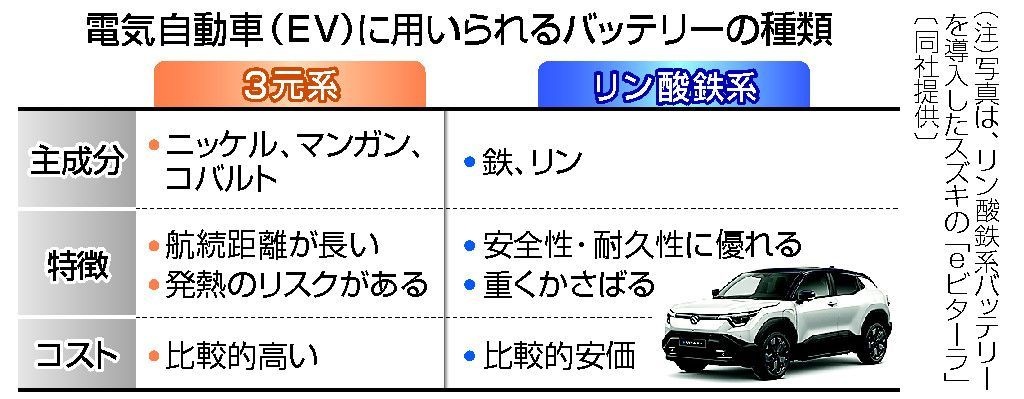 スズキが来年1月に発売する多目的スポーツ車(SUV)タイプの小型EV「eビターラ」では、中国EV最大手の比亜迪(BYD)など中国勢が得意とする「リン酸鉄リチウムイオンバッテリー」が採用されたことが話題を呼んだ。「リン酸鉄系」は、安全性と耐久性が高く、安価なのが利点。一方、蓄えられるエネルギーに関わる内部の密度が低く効率が悪いため、航続距離が伸びないとされてきた。