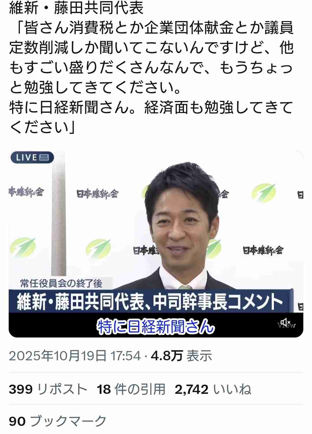 維新・藤田共同代表「日経新聞さん!経済面をちゃんと勉強してきてください」