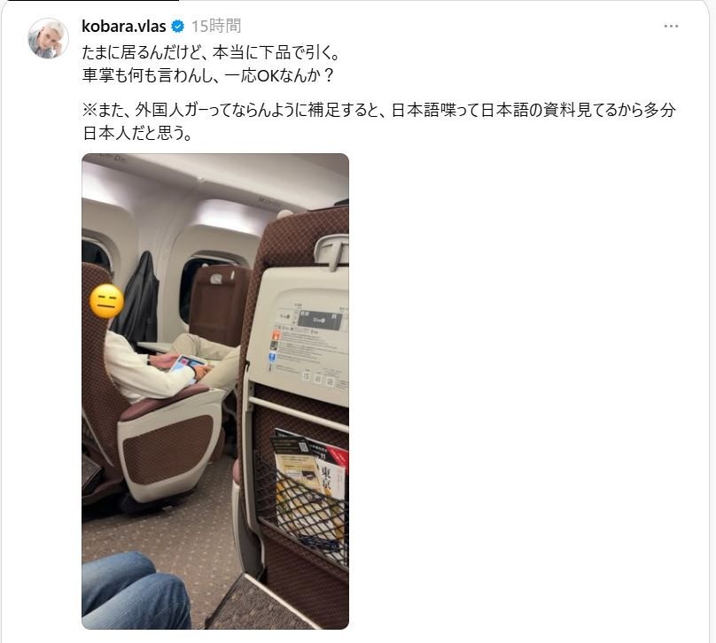 小原は、新幹線のグリーン車と見られる座席で、テーブルに両足を乗せて座った乗客の写真をアップし、「たまに居るんだけど、本当に下品で引く」と不快感をあらわに。「車掌も何も言わんし、一応OKなんか?」と疑問を投げかけ、「また、外国人ガーってならんように補足すると、日本語喋って日本語の資料見てるから多分日本人だと思う」と記した。