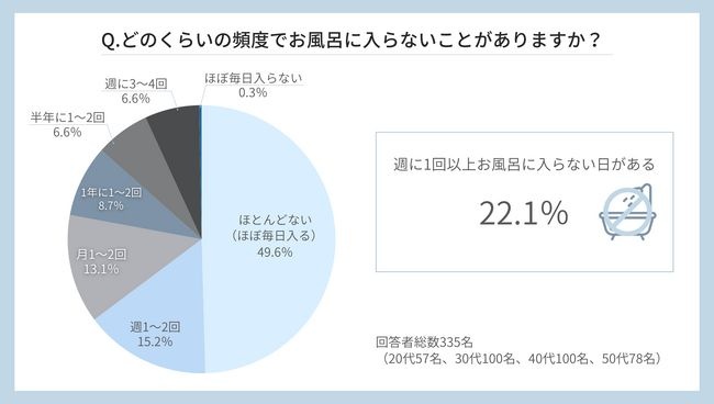 【”風呂キャンセル界隈”の実態調査】20~50代女性の22.1%が「週1回以上お風呂に入らない」!
