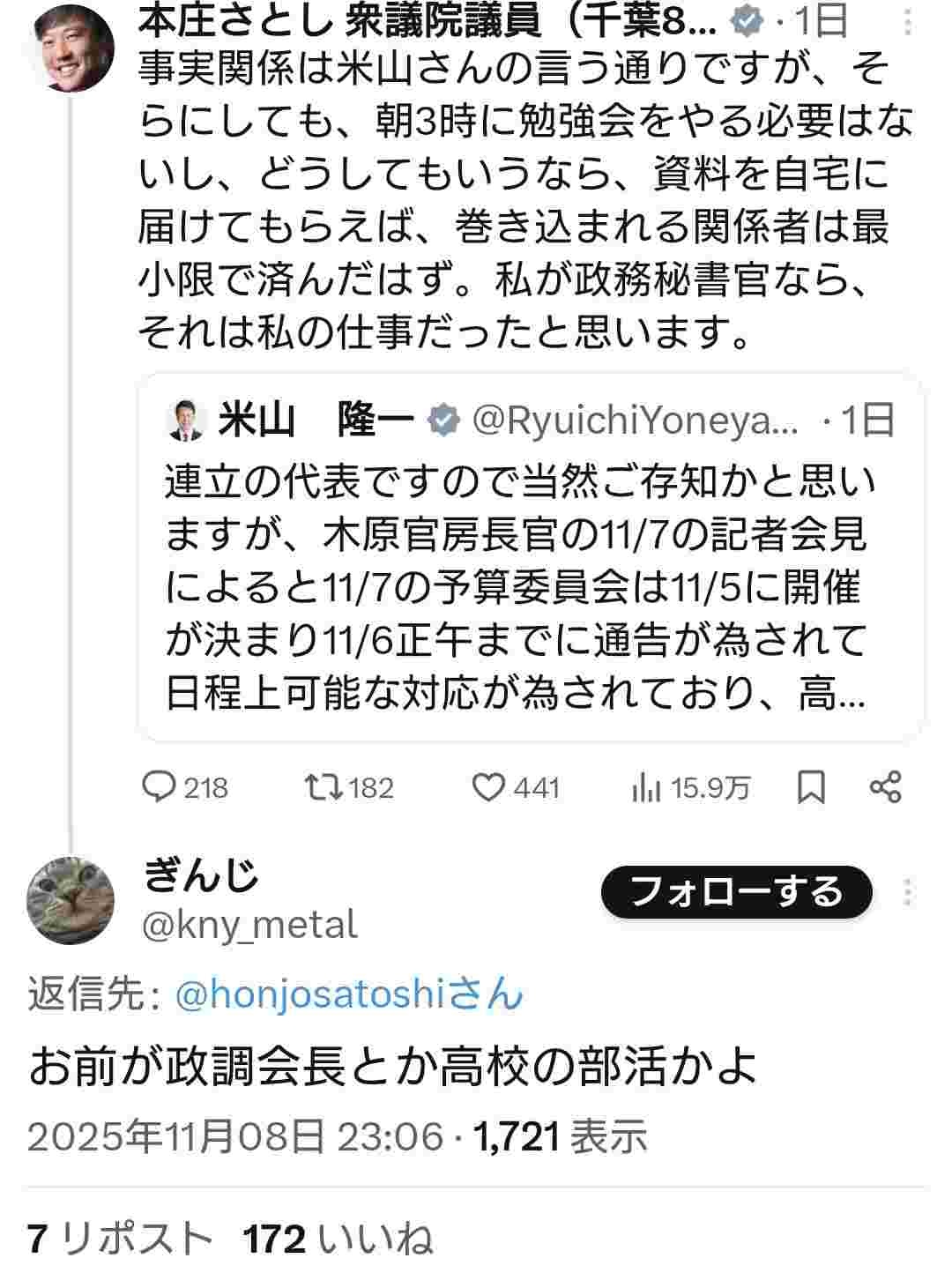 立憲・本庄議員「朝3時に勉強会をやる必要はないし、やるなら資料を自宅に届けてやれば」