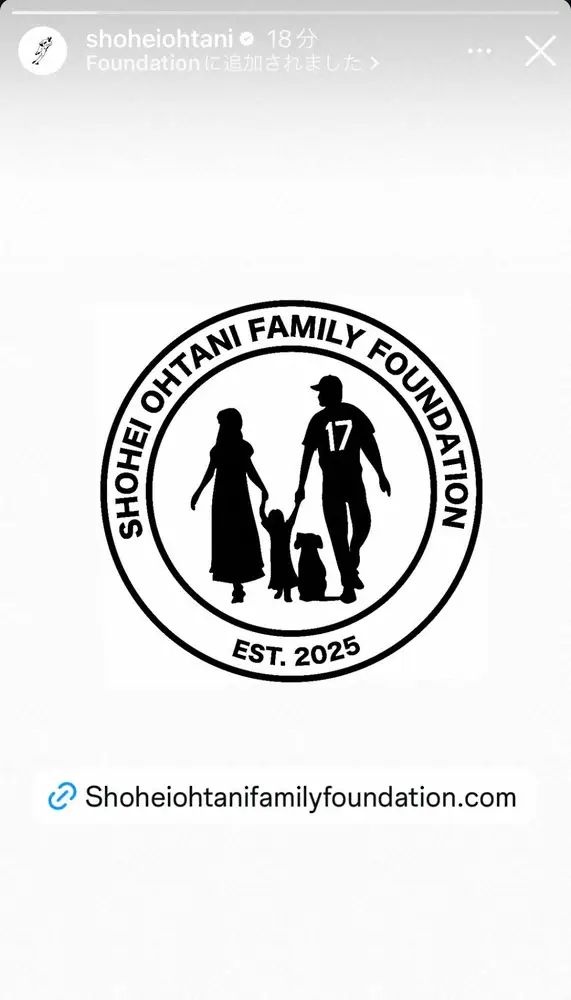 ストーリーズには大谷、真美子夫人、長女が手をつなぎ、デコピンを間に挟むような家族4ショットのシルエットの財団のロゴが投稿された。