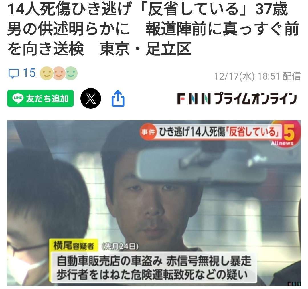 14人死傷ひき逃げ「反省している」37歳男の供述明らかに 報道陣前に真っすぐ前を向き送検 東京・足立区(FNNプライムオンライン(フジテレビ系)) - Yahoo!ニュース