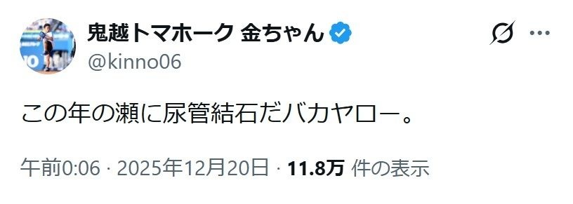 20日午前0時6分に「この年の瀬に尿管結石だバカヤロー」とポスト。さまざまな反響があった。
