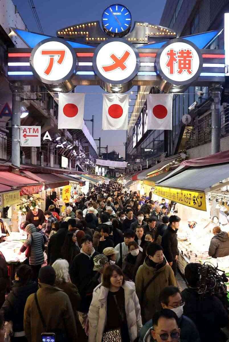 年の瀬を迎えた29日、東京・上野のアメ横商店街は正月用の食材などを求める多くの買い物客でにぎわいを見せていた。