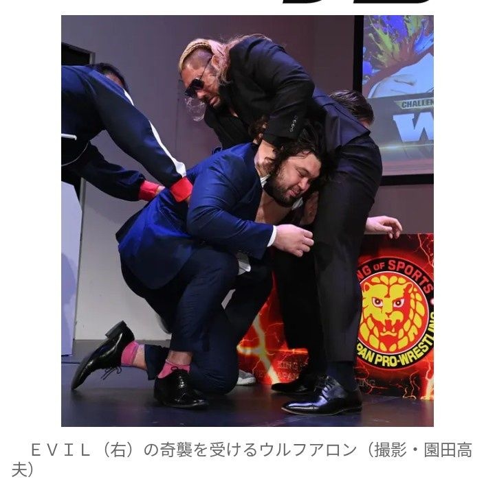 EVILは言いたいことを言い切った後は質疑応答には応じず。写真撮影でツーショットになると、いきなりウルフの隙を突いて襲いかかり、シャツのボタンが四方八方に飛び散って、五輪王者の胸毛混じりの大きな胸板があらわになった。