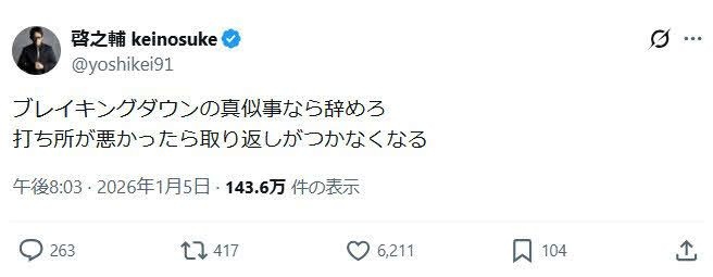 啓之輔は直接的な記述はないが「ブレイキングダウンの真似事なら辞めろ 打ち所が悪かったら取り返しがつかなくなる」と投げかけた。