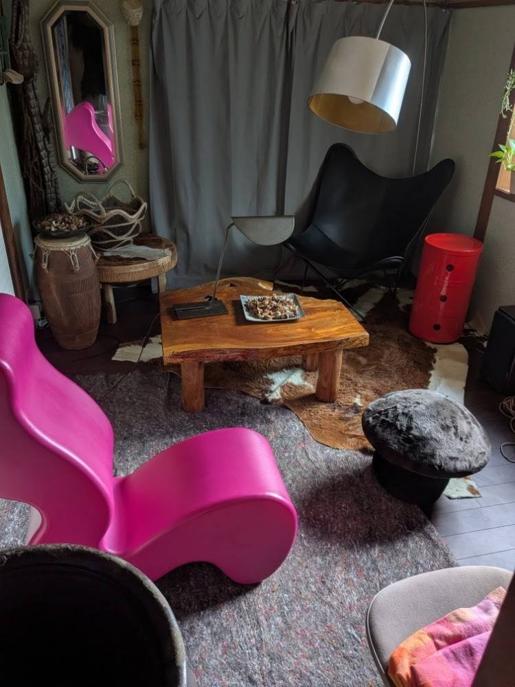 あと四角になってるとこに作業用デスク&椅子、見えにくいけどイームズのサイドシェルチェアでトータル5個かな