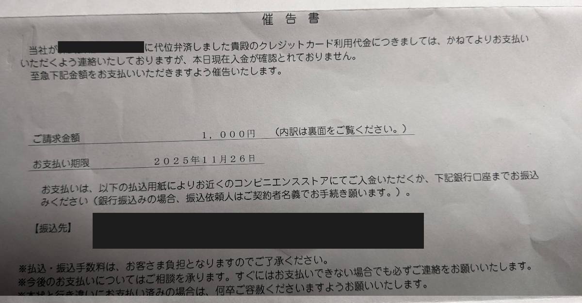 それを返せ、って債権回収会社、から委託された弁護士が送ってきてるようだな もうクレカ会社は完全に無関係っぽい