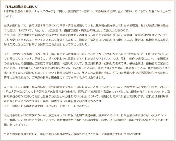 朝日放送テレビのバラエティ番組「探偵!ナイトスクープ」で1月23日に放送された「6人兄妹の長男を1日だけ代わって欲しい」という依頼をめぐり、「依頼者である長男は、保護されるべきヤングケアラーでは」と話題になり、両親のSNSに批判が殺到した問題で、同局は26日夜、番組の演出が誤解を招いたとして、「深く反省している」とコメントを出した。