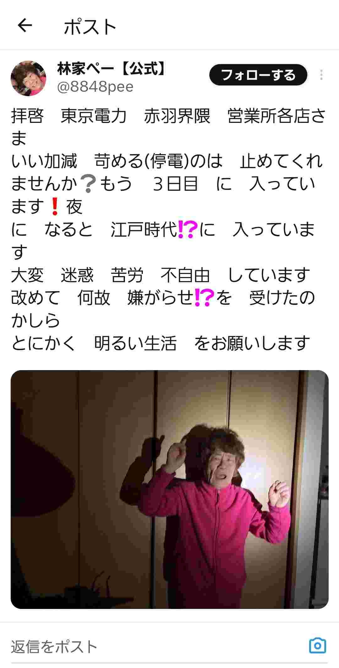ペーは「今(1月31日朝から)停電状態で非常に困っております助けて下さい」と電力会社に求める。