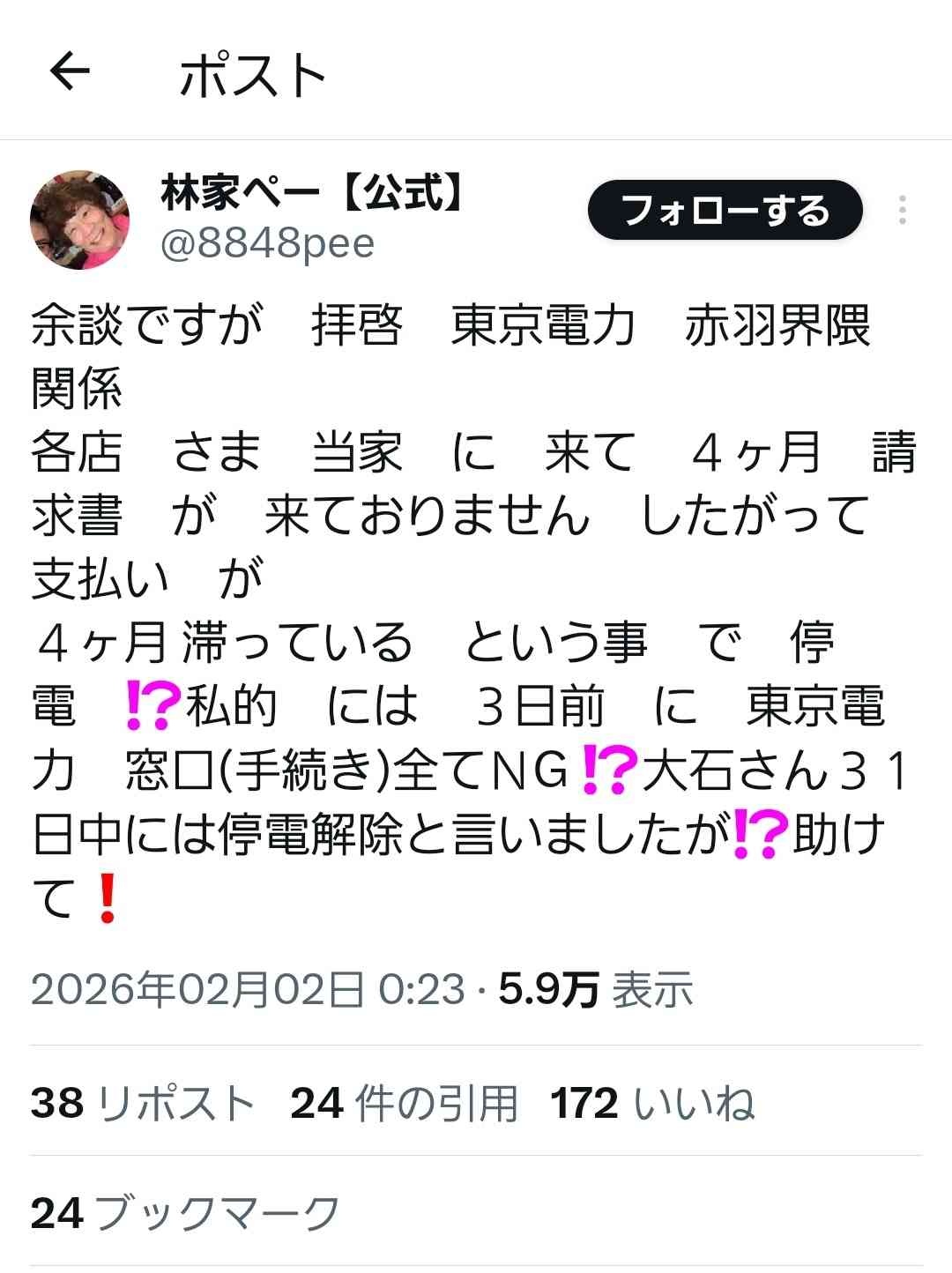ペーは「今(1月31日朝から)停電状態で非常に困っております助けて下さい」と電力会社に求める。