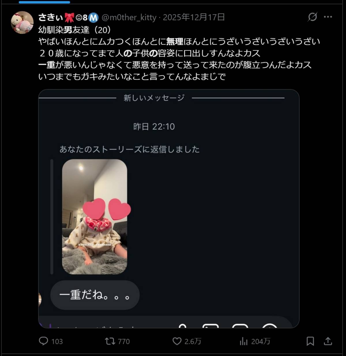 20歳ママさん「友達に息子の画像を送ったら『一重だね』って言われた。ごめんマジでイライラする」