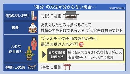 そして、処分の方法が分からない場合ですが、まず『寺院のお札・お守り』は、寺院に返納となります。『鏡餅』は、お供えしたものは食べて、残ったプラスチック容器は自身で処分してください。『人形』や『正月飾り』は、プラスチック使用の製品が多いため、最近は“受け入れ不可”のところが増えているといいます。自宅でできる処理方法としては、紙に包んで塩をふった後、「ありがとう」と感謝の気持ちを伝え、そのあとは各自治体のルールに沿って廃棄してください。そして『神棚』『しめ縄』に関しては、神社に相談してください。