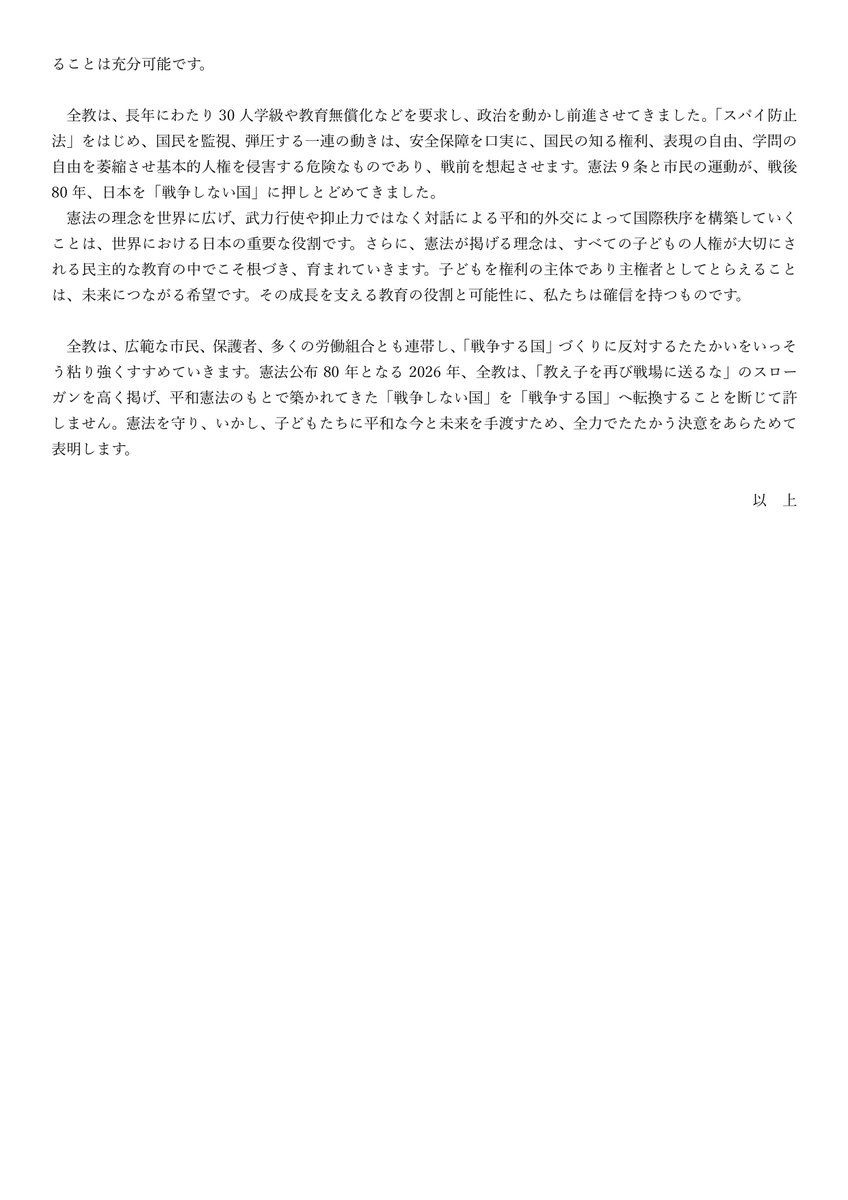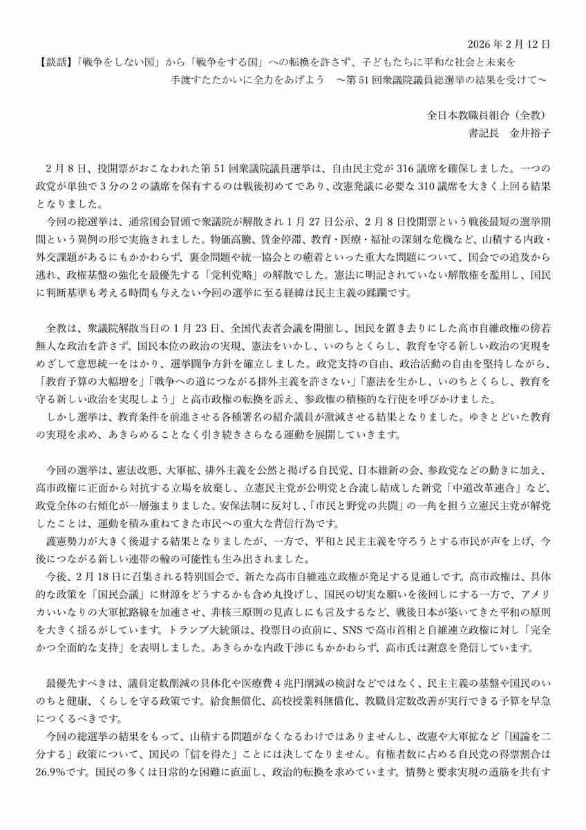 【談話】「戦争をしない国」から「戦争をする国」への転換を許さず、子どもたちに平和な社会と未来を 手渡すたたかいに全力をあげよう ~第51回衆議院議員総選挙の結果を受けて~ | 全日本教職員組合(全教)