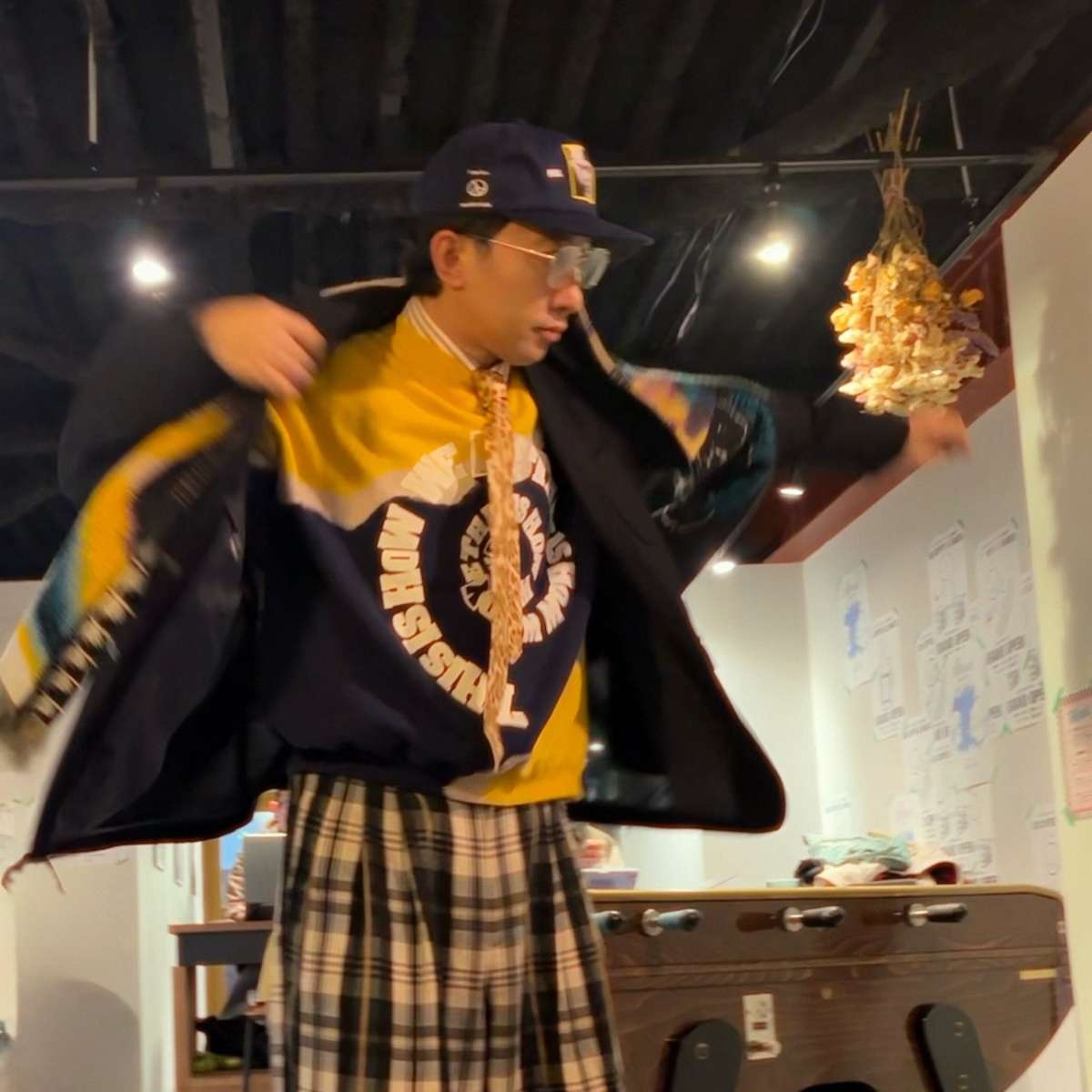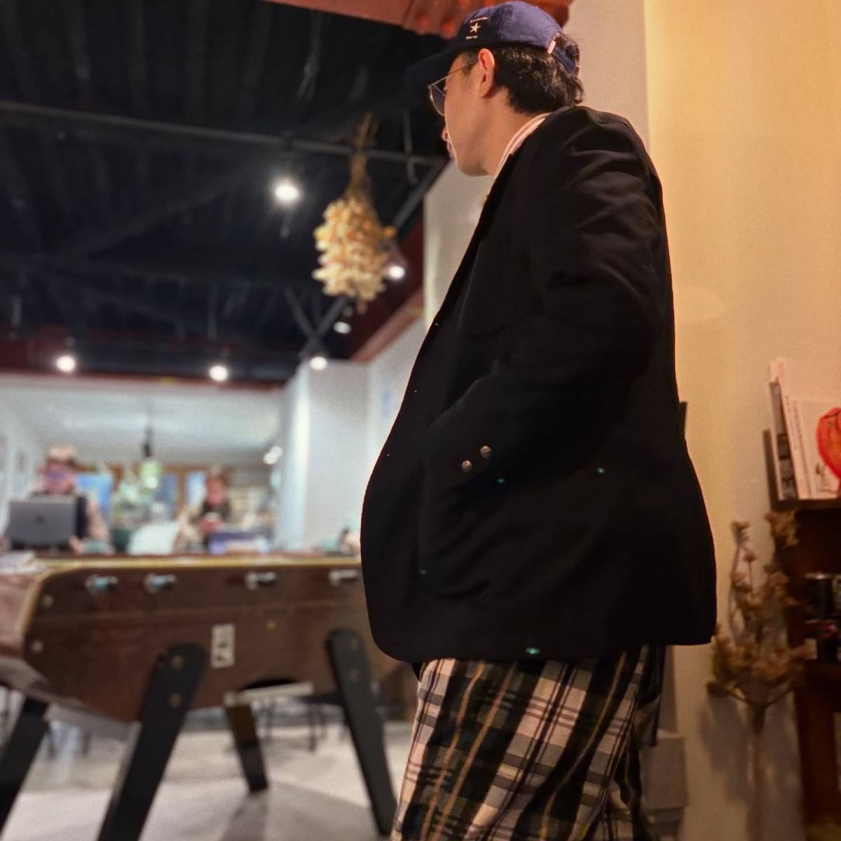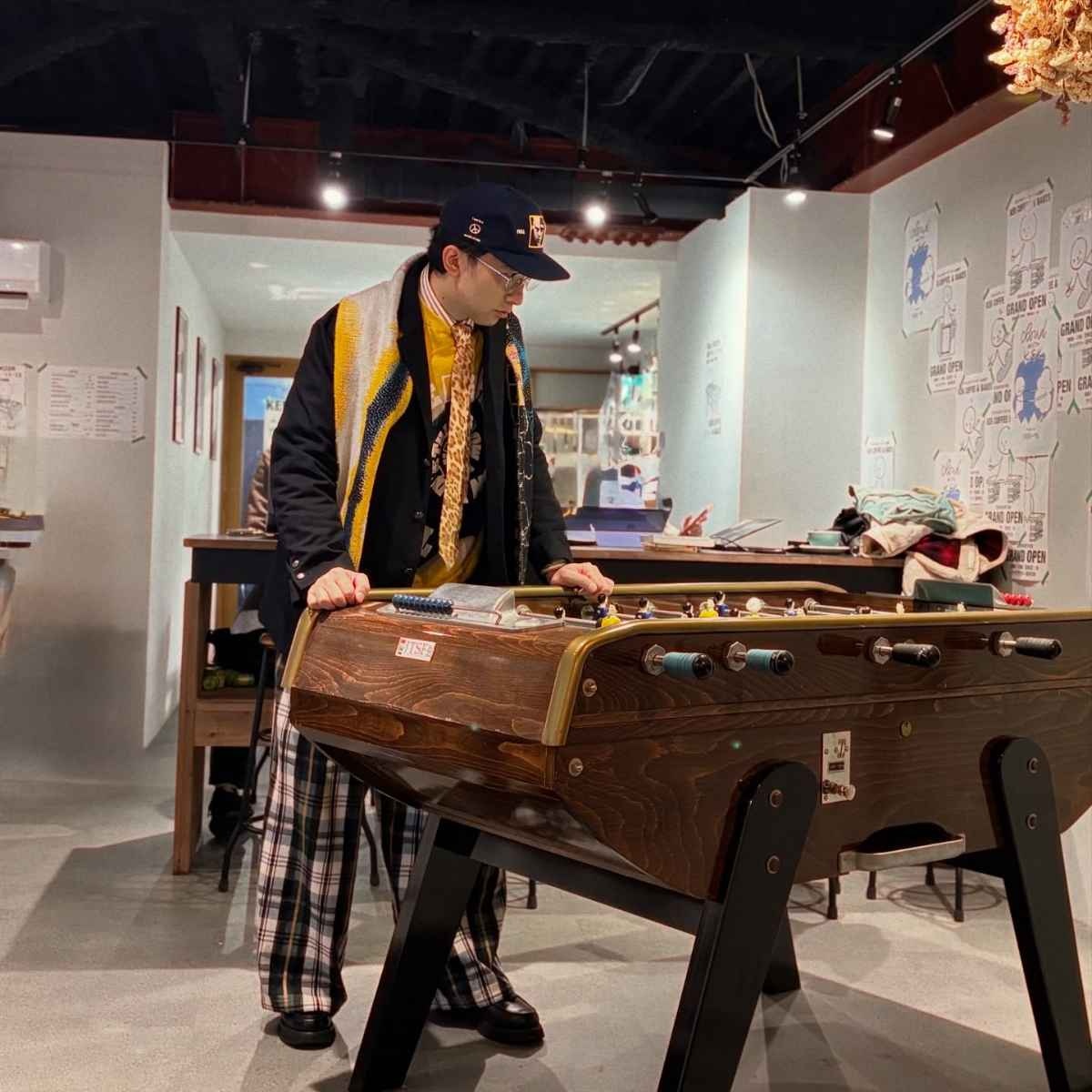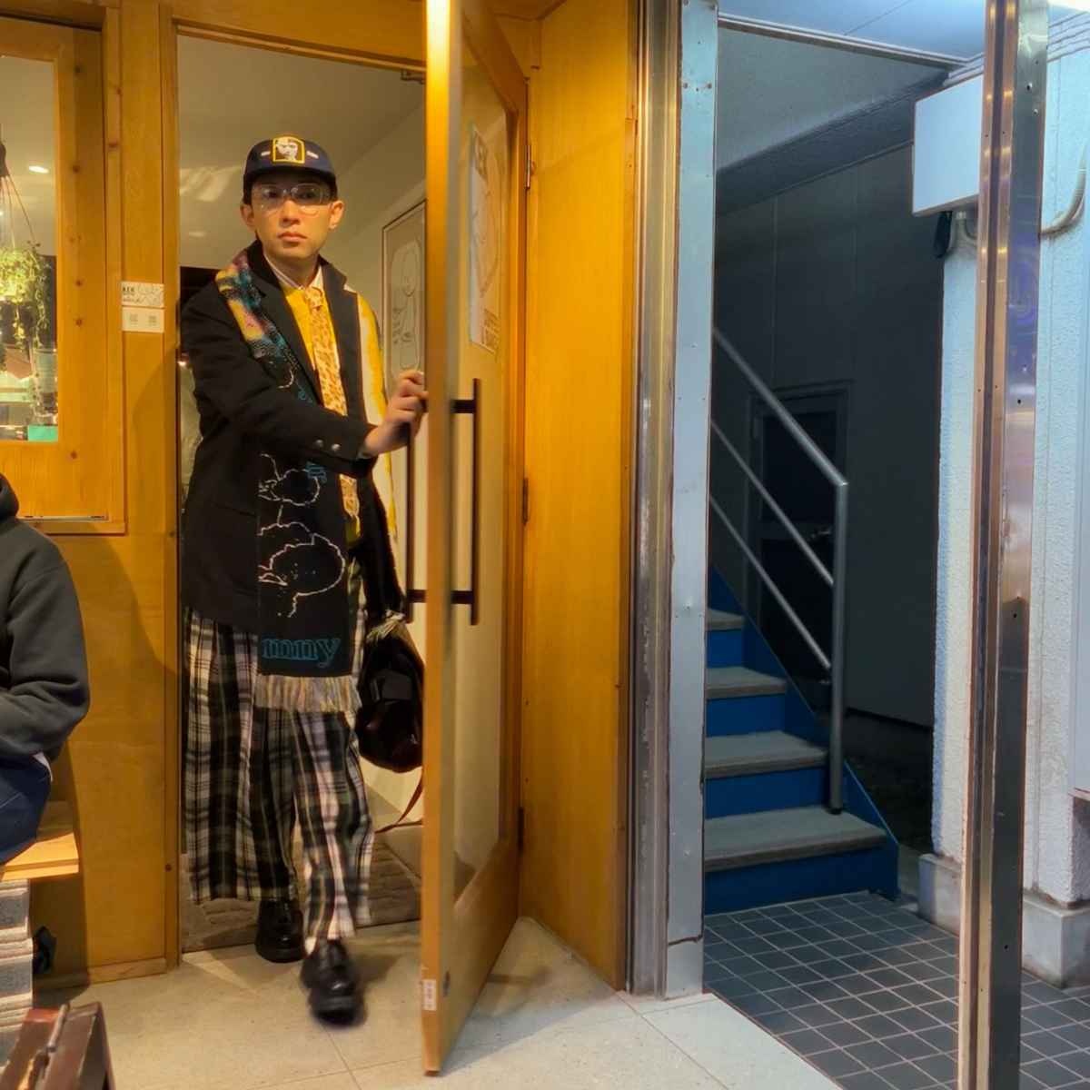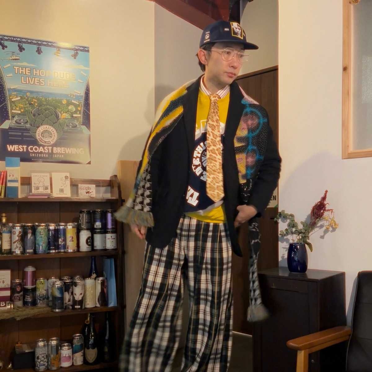 そんなこがさんは、シャツ・スウェット・ネクタイ・キャップ・ワイドパンツそしてジャケットや眼鏡やマフラーまでも自在に駆使。「まぁ、ファッションは好きにやったらいいよね」と、〝好きなだけでは出来ない〟都会的で大人ポップなコーディネートを、コーヒーハウスの雰囲気の中で堂々と披露しています。
