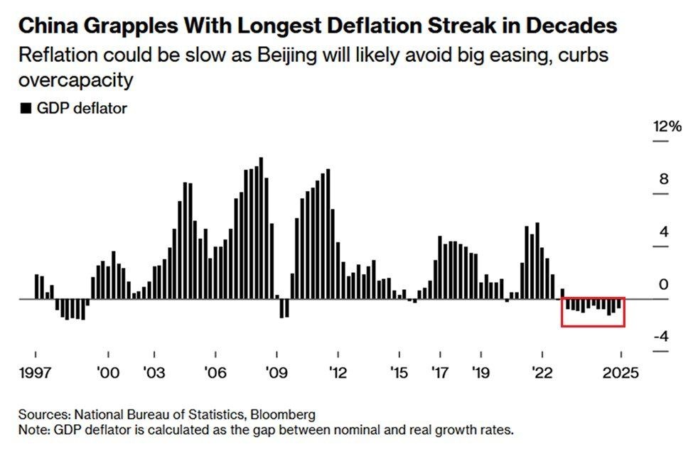 中国はここ数十年で最も長いデフレ局面に陥っている。2025年第4四半期のGDPデフレーターは前年比マイナス0.7%となり、これで11四半期連続のマイナスとなった。少なくとも過去30年以上で最長の記録である。中国はすでに3年連続でデフレ状態にあり、市場経済へ移行した1970年代後半以降で最も長いデフレ期間となっている。